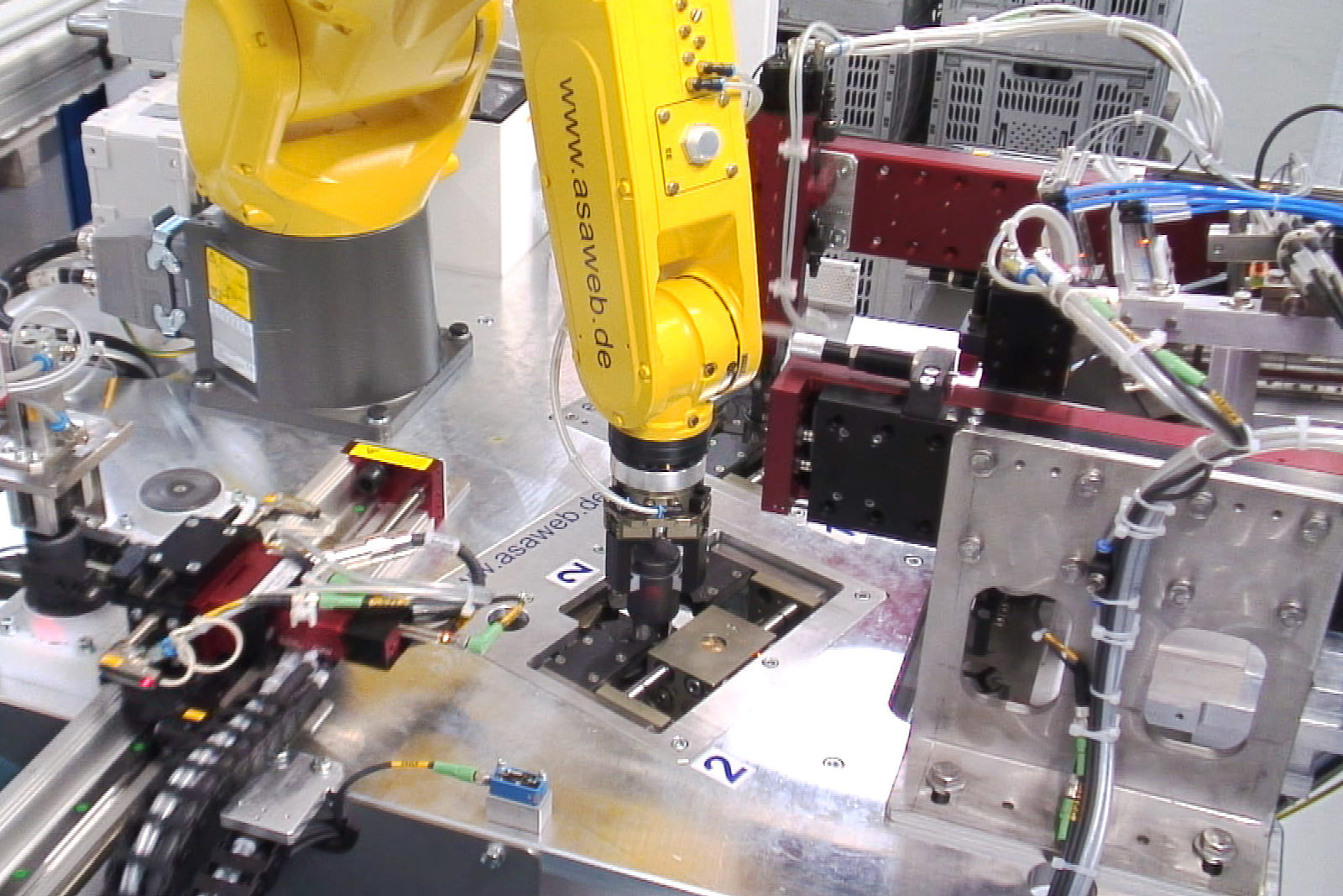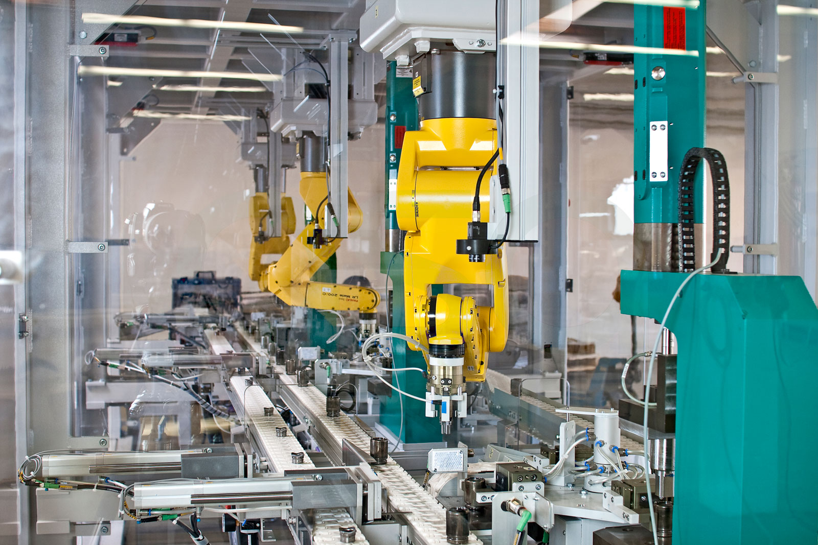 Diese verkettete Anlage für eine mannlose Produktion und Montage von Bremskolben für PKW-Bremsscheibensättel schafft grundlegende Anforderungen wie bestimmter hoher Durchsatz, hohe Prozesssicherheit und exzellentes Qualitätsniveau. Ausgelegt wurde die Anlage für unterschiedliche Kolben-Varianten und Produktgenerationen für Vorder- und Hinterachsen. 18 Roboter umfasst dieses Handlingsystem die teils die Handhabungsaufgaben, teils die Prozessfunktionen übernehmen.