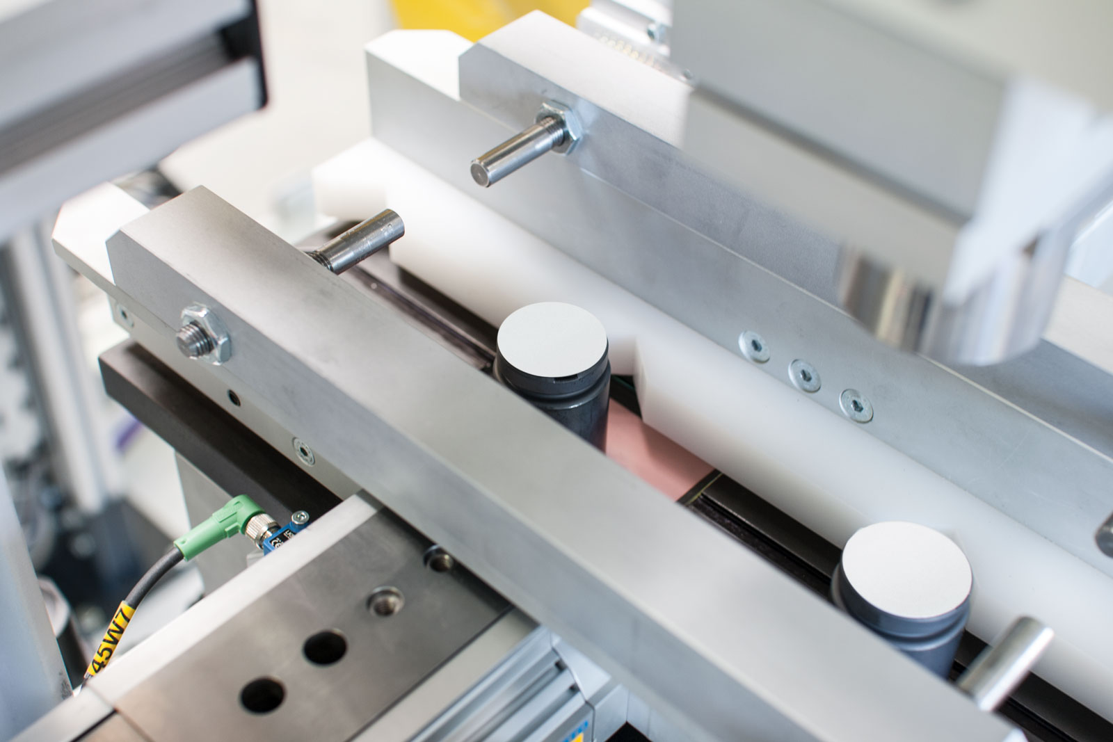 Die Bremskolben werden über eine Vereinzelungseinheit zur Spendestation geführt. In der Station werden dann die Etiketten mit Hilfe optischer Sensorik, einem Etikettenspender mit Vorschub und Linearachsen auftragsbezogen gespendet, aufgesetzt und schlussendlich mit einem Nachdruckzylinder auf dem Kolben fixiert. Danach verlässt der etikettierte Kolben die Station zur weiteren Verarbeitung.
