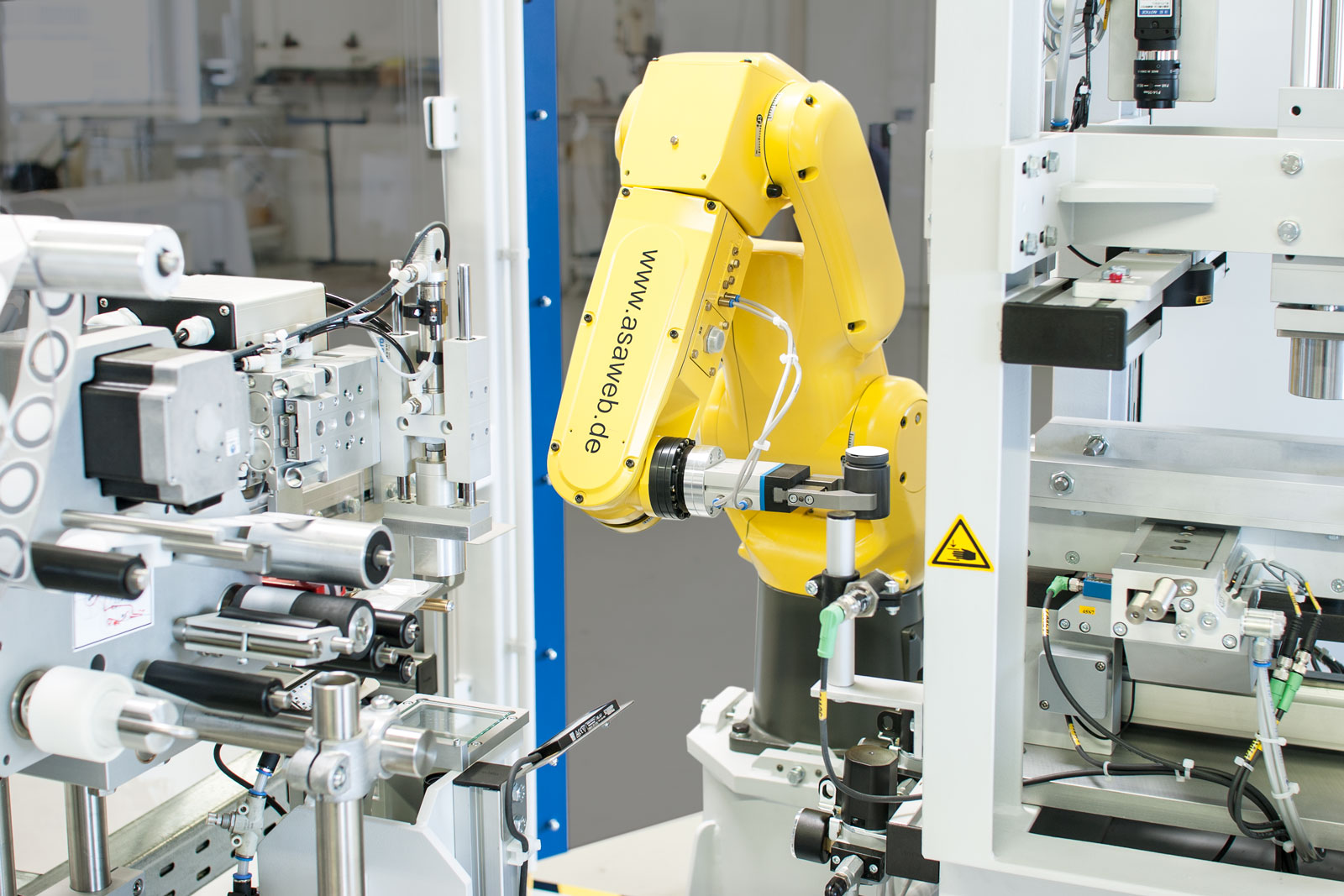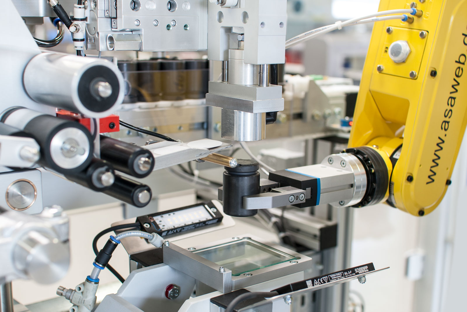 Diese von ASA Automation für einen internationalen Zulieferer der Automobilindustrie entwickelte Automatisierungsanlage übernimmt die Aufgabe, Etiketten mit definierten Abziehkräften mittels Roboter und Vision-System präzise orientiert und positioniert aufzusetzten.