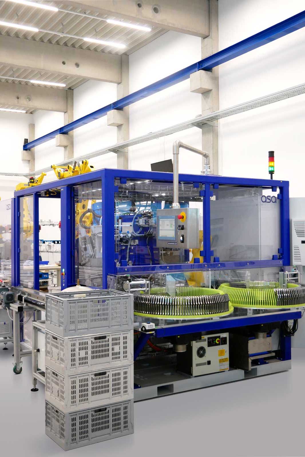 Diese Bearbeitungsanlage von ASA Automation mit geringer Aufstellfläche umfasst das vollautomatische Bohren und Entgraten mittels zweier Mehrspindelbohrköpfe von Werksstücken für die Automobilindustrie.