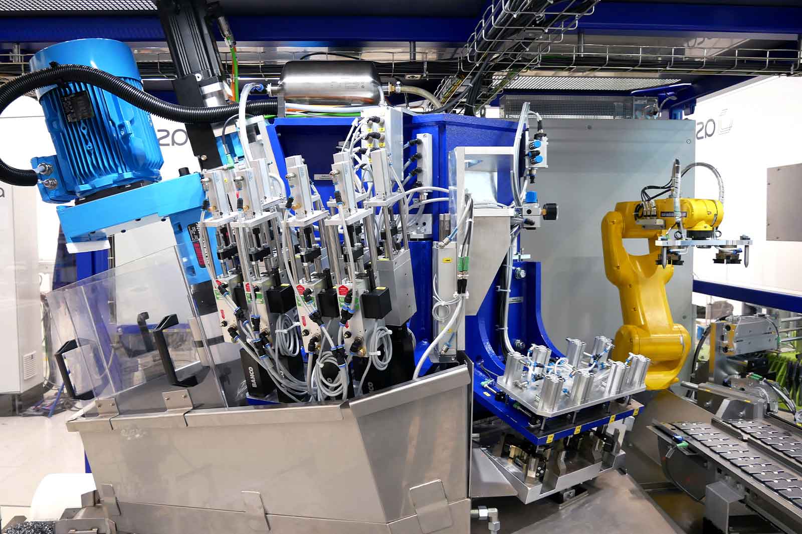 Die Bestückung und Entnahme erfolgt mittels einem LR Mate 200iD7L von Fanuc. Zwei Rohteilepuffer, mit einem Fassungsvermögen von je 135 Stück, versorgen den Roboter mit den Werkstücken. Bearbeitet werden können zwei unterschiedliche Werkstücke, und dass bei einer Taktzeit von 5,5 Sekunden.