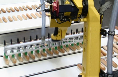 En lugar de complejos mecanismos, los robots se encargan de la manipulación entre el horneado y el envasado de bollos para perritos calientes en cuatro líneas de producción.